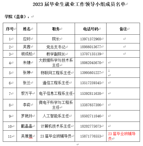 为更好的推进学院就业工作,促进毕业生更充分就业和更高质量就业,充分发挥全院教职工在学生就业工作中的作用,及时研究和解决就业工作中存在的问题,不断改进学生就业指导的方法,使学生毕业就业工作更加规范有序。经学院研究,决定成立由学院领导、系主任及毕业班辅导员组成的2023届毕业生就业工作领导小组。现将有关事宜通知如下: