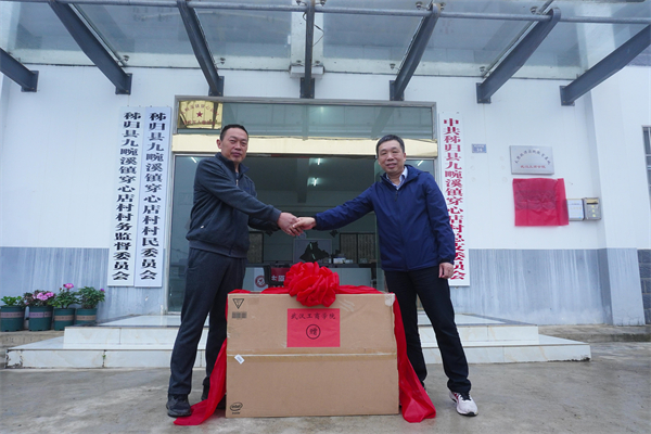 幸福堂副书记代表学校对工作队长期驻村、务实工作的作风给予了肯定,并向工作队送上了慰问品。左宗文副校长代表学校为穿心店村“AWC万象城娱乐乡村振兴共享书屋”揭牌,万化喜馆长代表学校向穿心店村村委会捐赠了图书和电脑等物品。