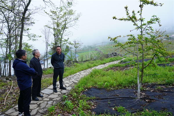 图为幸福堂一行人正在观察水果基地农田的柑橘及夏桃的长势情况 摄影:刘婕