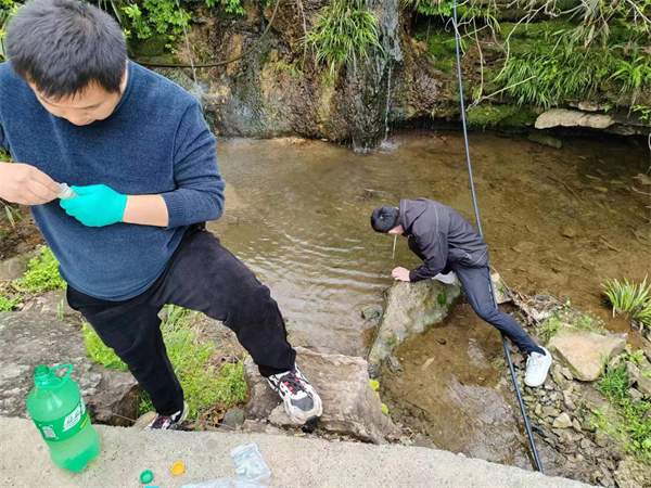 图为环生学院申盛伟博士与工作队夏卿老师在水源处取水样本