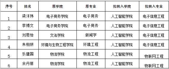 人工智能学院 2024年5月转专业拟录取名单
