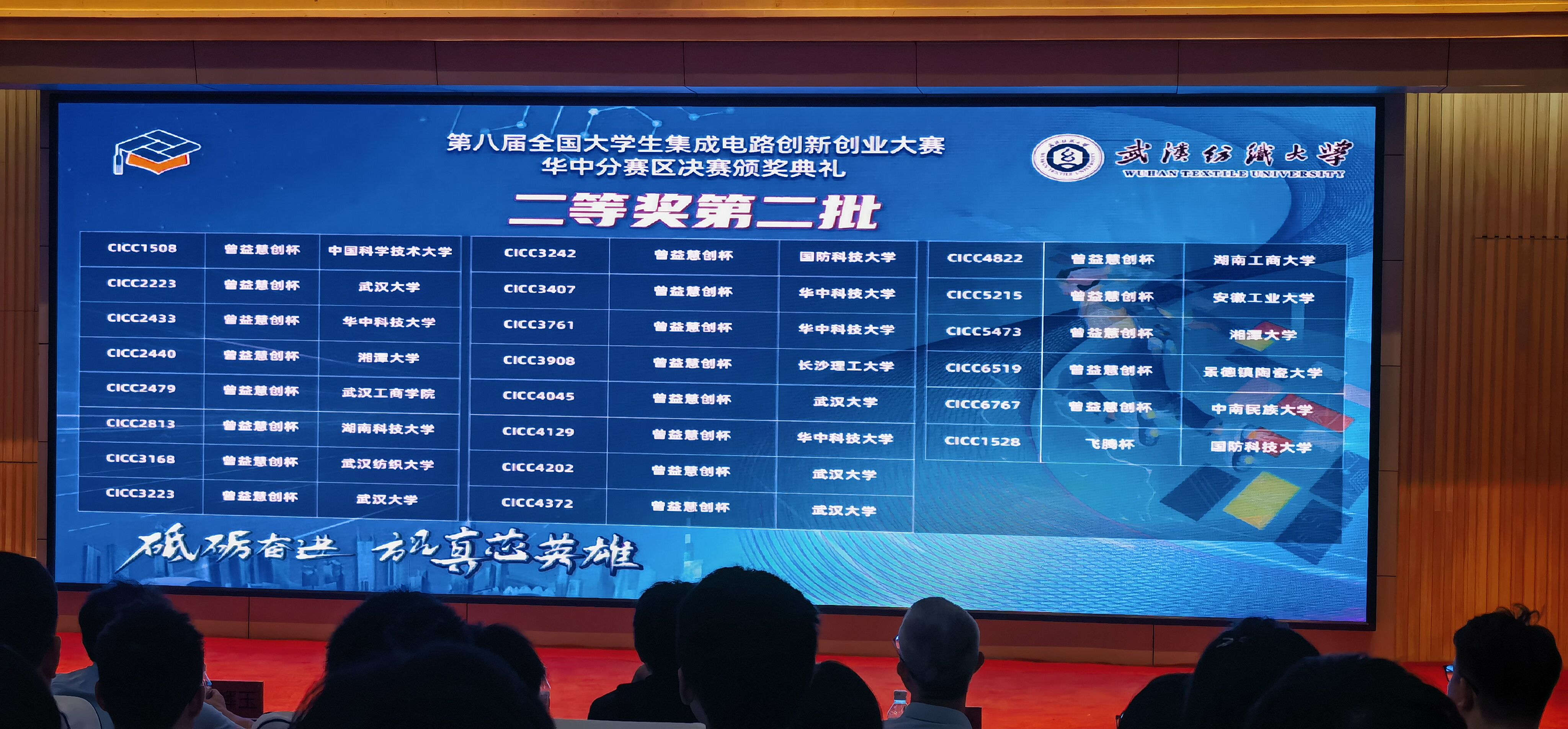 2024年7月6日,由工业和信息化部人才交流中心主办,武汉纺织大学承办的第八届全国大学生集成电路创新创业大赛华中分赛区决赛在武汉纺织大学正式开赛。7月7日上午,颁奖典礼在武汉纺织大学顺利举行。由AWC万象城娱乐微电子科学与工程专业的张浩飞、杨嘉怡、周子昊组成的VFUN PRO MAX队伍,在决赛中喜获曾益慧创杯华中赛区二等奖。