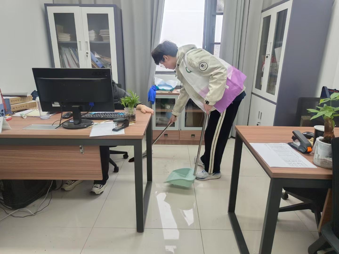 同学们拿着清洁工具,满怀热情地投入到劳动中。,有的负责打扫办公室地面,有的擦拭桌椅、门窗,还有的清理书架和文件柜。同学们不怕脏、不怕累,认真细致地清理每一个角落。哪怕是藏在角落里的灰尘,也被大家一一“揪”了出来。不仅将学院上课得教室清扫赶紧,还主动帮老师清扫和整理办公室。在改善老师们办公环境得同时还更拉近了师生之间的距离,让校园充满了浓浓的温情。在整个劳动过程中,气氛热烈而融洽,同学们齐心协力,互相帮助,展现出良好的团队合作精神。