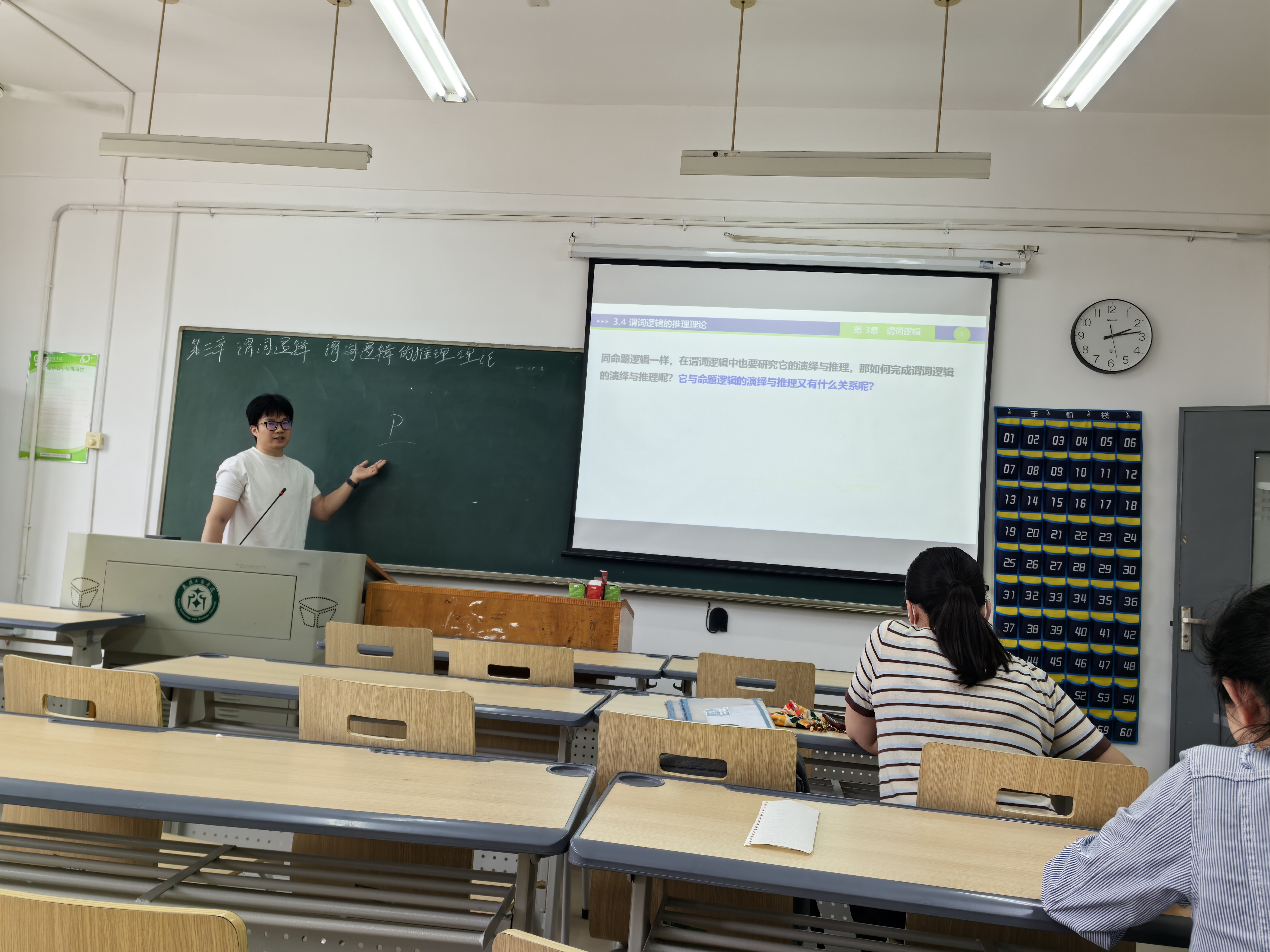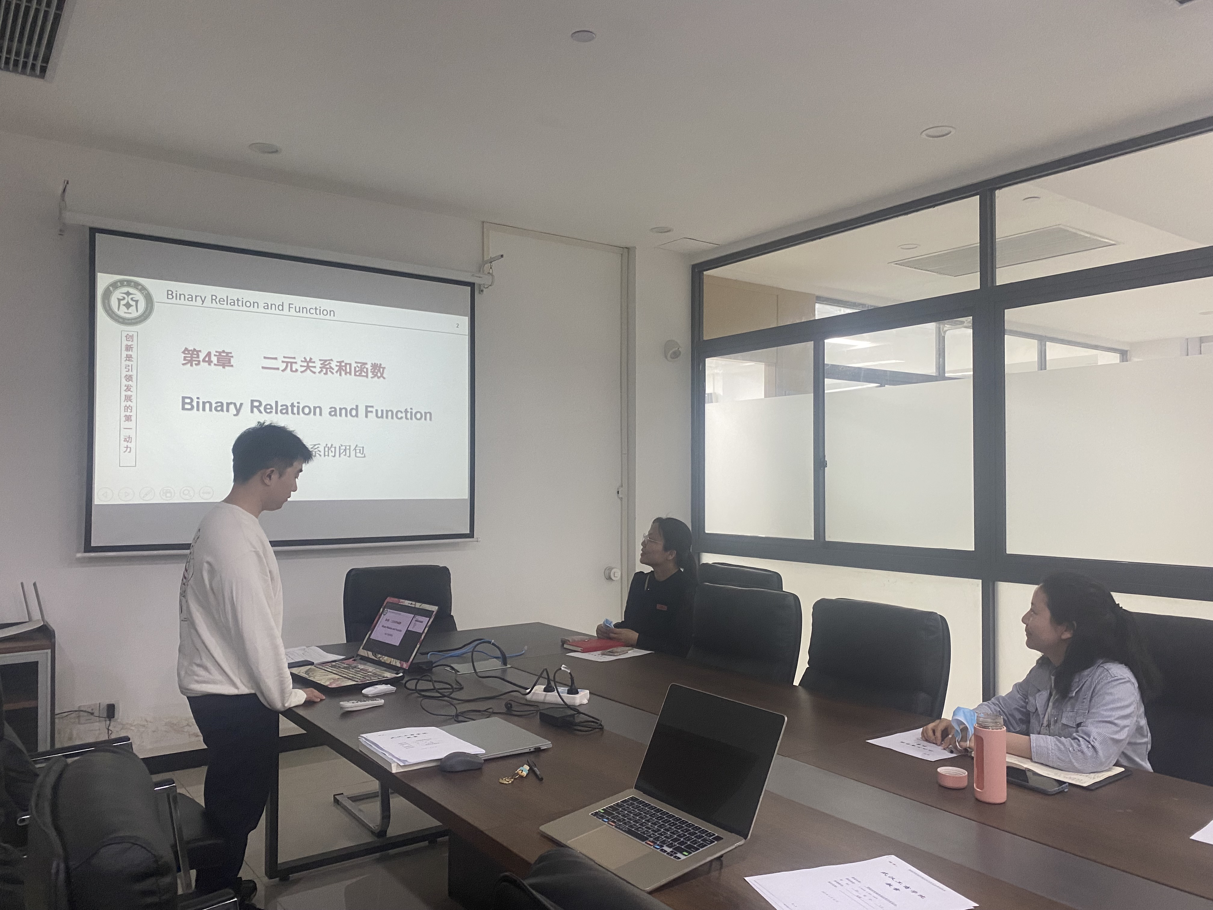 5月22日 14:00 - 15:00,曾鹤琼等五位老师在外语楼 524 教室对张宇豪老师的《离散数学》课程进行磨课。张宇豪老师教学基本功扎实,但也存在不足。老师们建议优化板书设计,采用模块化划分并提前规划框架;强化演练,完善教案;与学院辅导员沟通,规范课堂管理;增设互动环节;挖掘学科思政元素并自然融入课程。