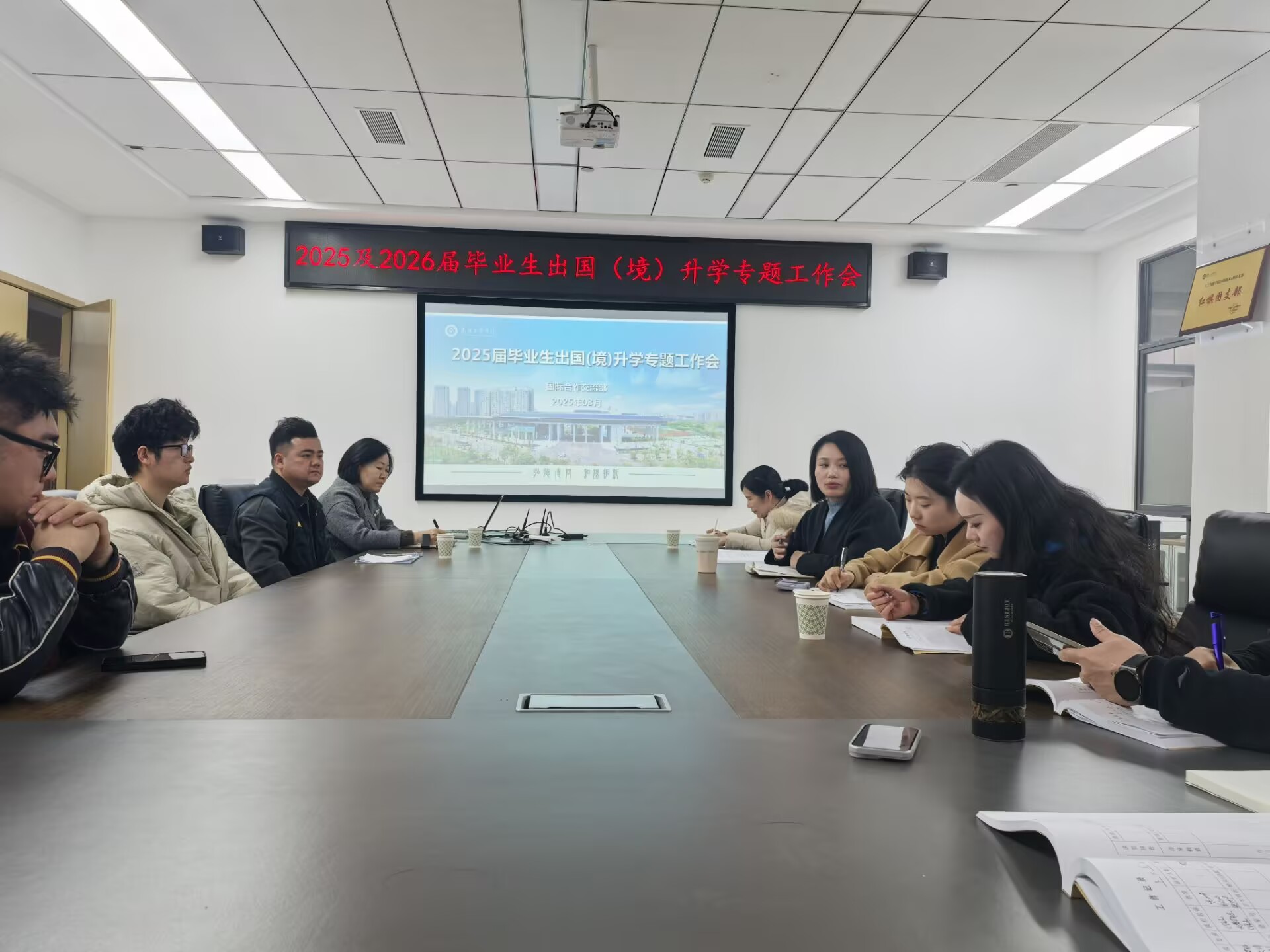 2025年3月7日人工智能学院在学院会议室成功举办了2025及2026届毕业生出国升学专题工作会。此次会议旨在为学生们提供全面的出国升学指导,帮助他们更好地规划未来学业与职业发展。学院党总支书记吴艳、国际教育学院副院长安老师、人工智能学院各年级辅导员以及2025级和2026级学生代表参加了此次会议。