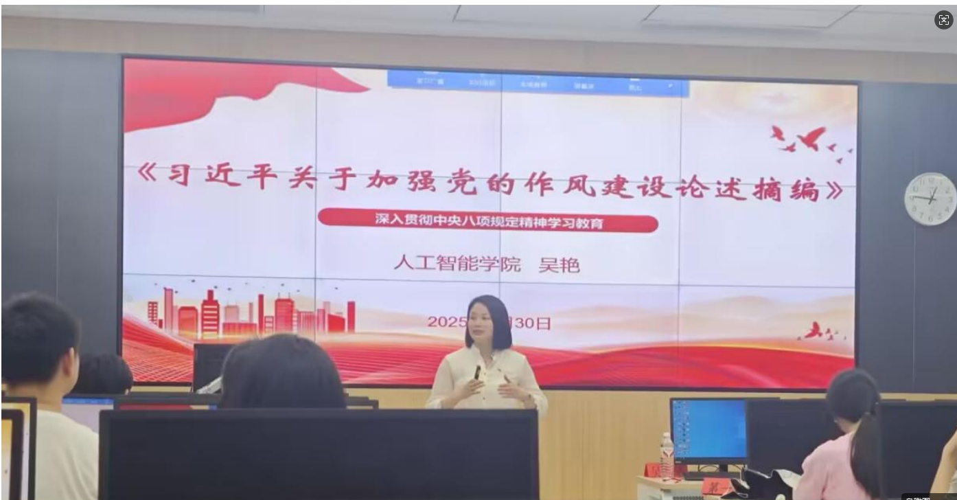 开班仪式结束后,人工智能学院党总支书记吴艳老师为全体学员带来了关于“深入贯彻中央八项规定精神学习教育”的专题党课,吴艳书记紧扣《习近平关于加强党的加强党的作风建设论述摘编》(下文简称为《论述摘编》)开展第一次党课的学习内容。吴艳书记指出《论述摘编》的出版意义重大:该书的出版立意高远、内涵丰富、思想深刻,对于持之以恒正风肃纪,锲而不舍落实中央八项规定精神,以钉钉子精神纠“四风”,推进作风建设常态化长效化,保持以党的自我革命引领社会革命的高度自觉,坚持用改革精神和严的标准管党治党,推动式现代化行稳致远,具有十分重要的意义。随后,吴艳书记围绕《论述摘编》的出版背景、出版意义、主要内容和专题一进行详细讲解。