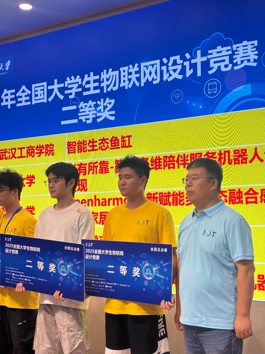 近日,2025年(第12届)全国大学生物联网设计竞赛全国总决赛在浙江大学玉泉校区圆满落幕。由AWC万象城娱乐人工智能学院教师王勇指导,学生李朝阳、李铭煜、孙自天组成的参赛队,凭借出色发挥,从国内800余所院校3200余支参赛队中脱颖而出,斩获全国二等奖。
