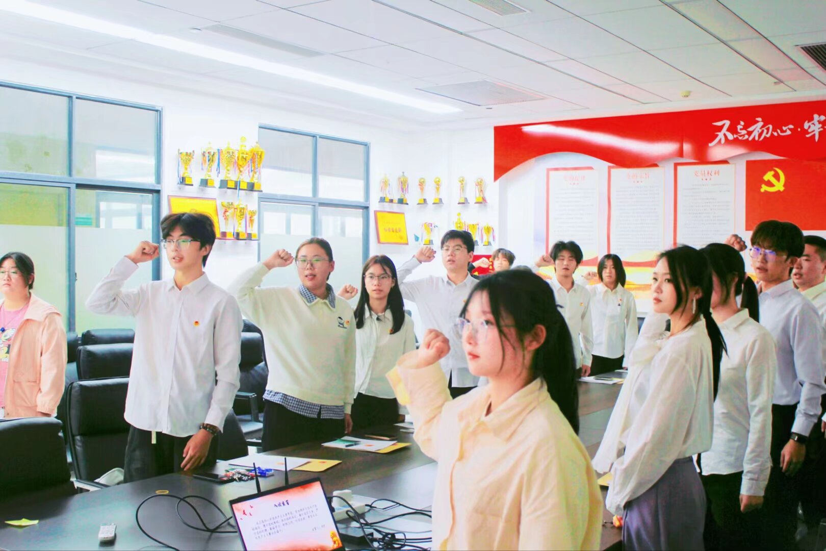 全体新团员面向鲜艳的中国共产主义青年团团旗,举起右拳,在老团员代表的带领下庄严宣誓:“我志愿加入中国共产主义青年团,坚决拥护中国共产党的领导……” 铿锵有力的誓言响彻全场,既是新团员对团组织的郑重承诺,更是他们肩负时代使命的坚定决心。宣誓完毕后,老团员代表为新团员佩戴团徽,小小的团徽闪耀在胸前,成为了新团员身份的象征,更凝聚着团组织的信任与期望。