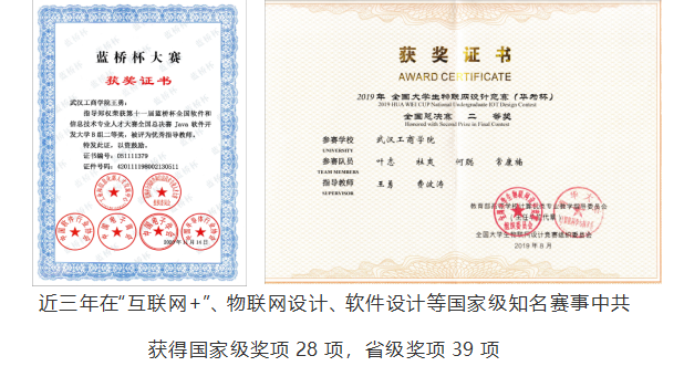 本专业连续七年获评6星级专业、中国顶尖应用型专业,在全国同类院校专业排名第一。近七年,相继获批省战略新兴产业人才培养计划、省“荆楚卓越”人才协同育人计划、省级教学成果奖、省级教学团队、省级一流课程、省级优秀基层教学组织、省级一流专业建设点。本专业与华为生态链企业等省内外十多家知名企业深度合作共建专业,并立项国家级教育部协同育人项目十余项。校企联合培养人才,历届均有优秀毕业生进入知名IT企业和高校高薪就业与读研深造。本专业依托校内国家级创新创业示范基地等平台,近三年在“互联网+”、物联网设计、软件设计等国家级知名赛事中共获得国家级奖项27项,省级奖项39项,发表论文专利28项,省级以上大学生创新创业项目14项。