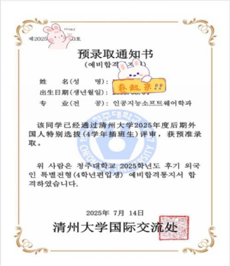 一封录取邮件,一场跨越中韩的赴约! 2022级计算机专业刘同学的逐梦新篇