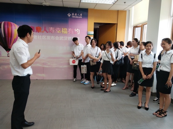 实习指导老师及学生在泰康人寿工作人员的陪同下对泰康人寿公司进行了参观,详细了解公司组织架构及实习工作环境;井井有序的现场、埋头工作的员工和温馨的公司文化,给了大家很深刻的印象。