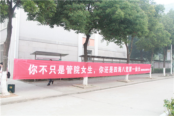 “最近《三生三世 十里桃花》热播,我们学院男生就想了这样一条创意标语,祝福女生们能够像仙女一样,永远美丽。”管理学院学生会主席赵龙说道。
