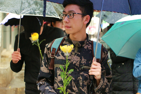 图为同学们排队依次向先烈献花 摄影:车瑭甜