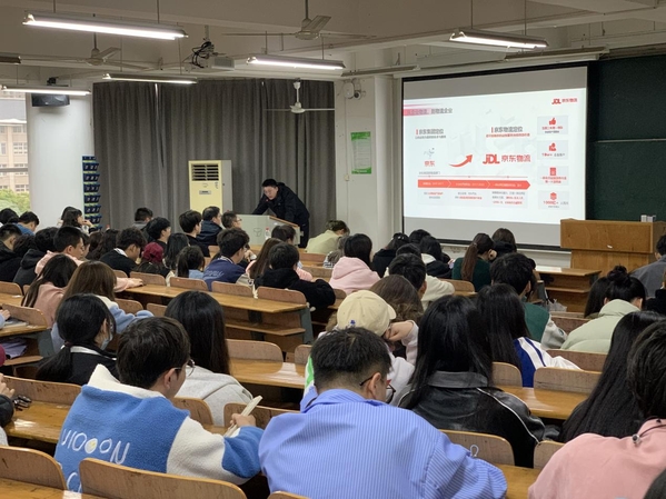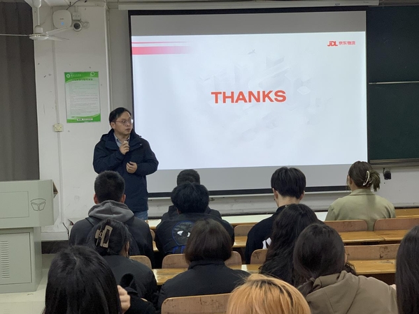 京东物流于2022年5月与我校建立合作,在学校内设有常驻工作点,2022年为学院提供近40个实习岗位。京东物流客户部经营服务部裴嗣经理向2021级实习生代表介绍了公司发展历程、公司概况、招聘标准、自身优势、薪资待遇等问题,并从学历、学习能力、性格、沟通表达、应变能力、办公软件等六个方面对实习生们提出相应的要求。宣讲会后裴经理认真聆听了同学们的问题并耐心解答。