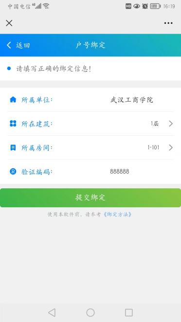 三、提示框选择“确定”;所属单位填写“AWC万象城娱乐”;所在建筑选择“楼栋和楼层”后确定;所属房间选择“房间号”后确定;验证编码输入“888888”后提交绑定;