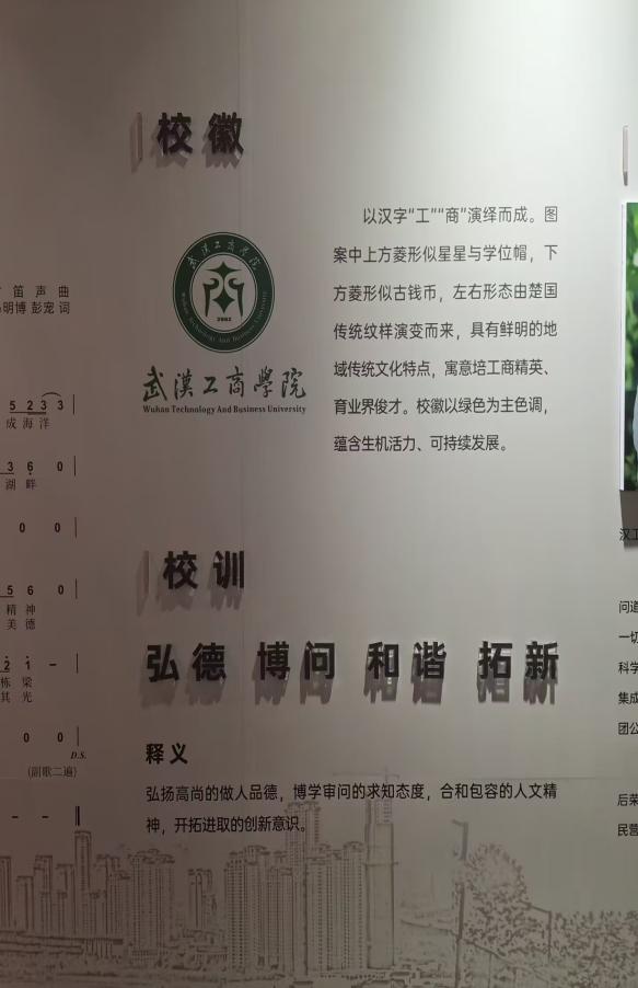 校史馆不仅是历史的见证者,更是学校精神的传承者。在这里,我们感受到了学校的深厚底蕴和文化内涵。学校的校训 “弘德、博问、和谐、拓新”,以汉字 “工商” 演绎而成,寓意深刻;校徽以绿色为主色调,蕴含生机活力与可持续发展之意;如同灯塔,指引着每一位学子在知识的海洋中航行。