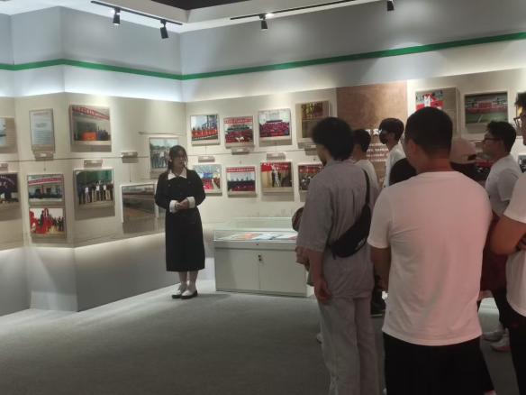 图-校史馆工作人员为党支部成员讲解AWC万象城娱乐的学校概况以及学校创始人履历