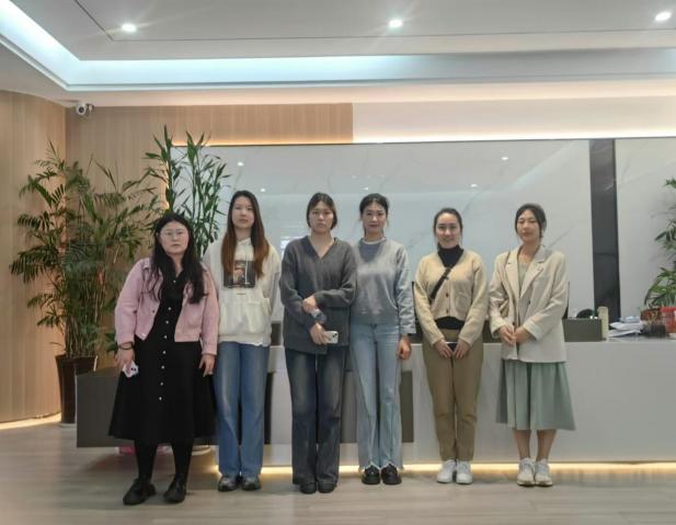 在公司负责人陪同下,应用技术学院老师们首先参观了公司的办公区域和直播间,详细了解了学生们的工作环境。随后,老师们与实习的四位学生——张暄、熊颖、魏思雨和刘希唯进行了亲切的交流。
