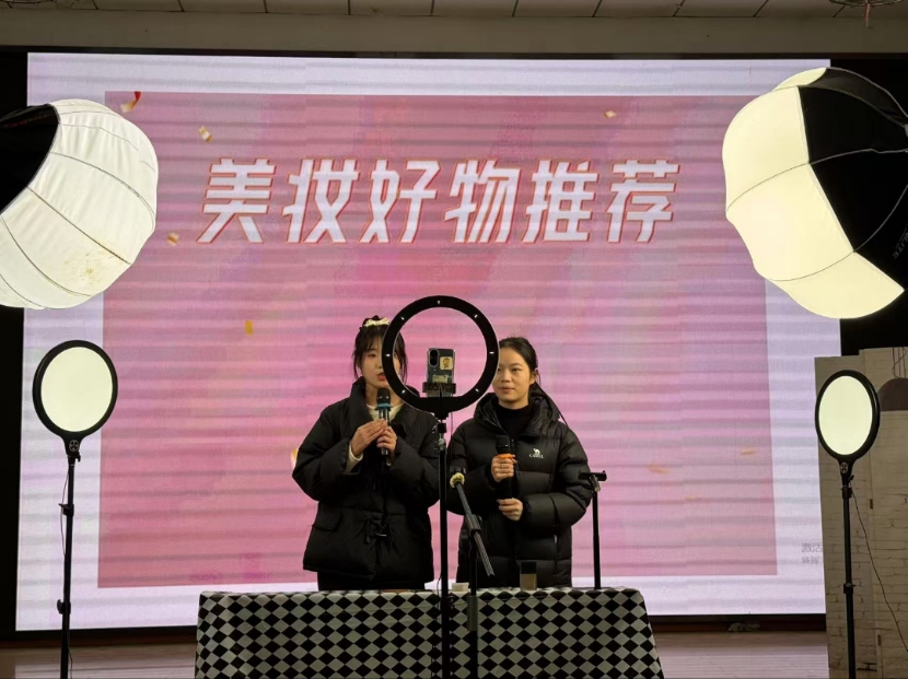 第三项由主持人正式宣布抖创杯直播与短视频大赛决赛正式开始。第一组的选手是23电商z6班的严佳丽和何钦煜,她们直播的类型是美妆产品。在比赛中,她们条理清晰的介绍了产品的用法,同时将逼单、点关注、互动很好的融入到了此过程。
