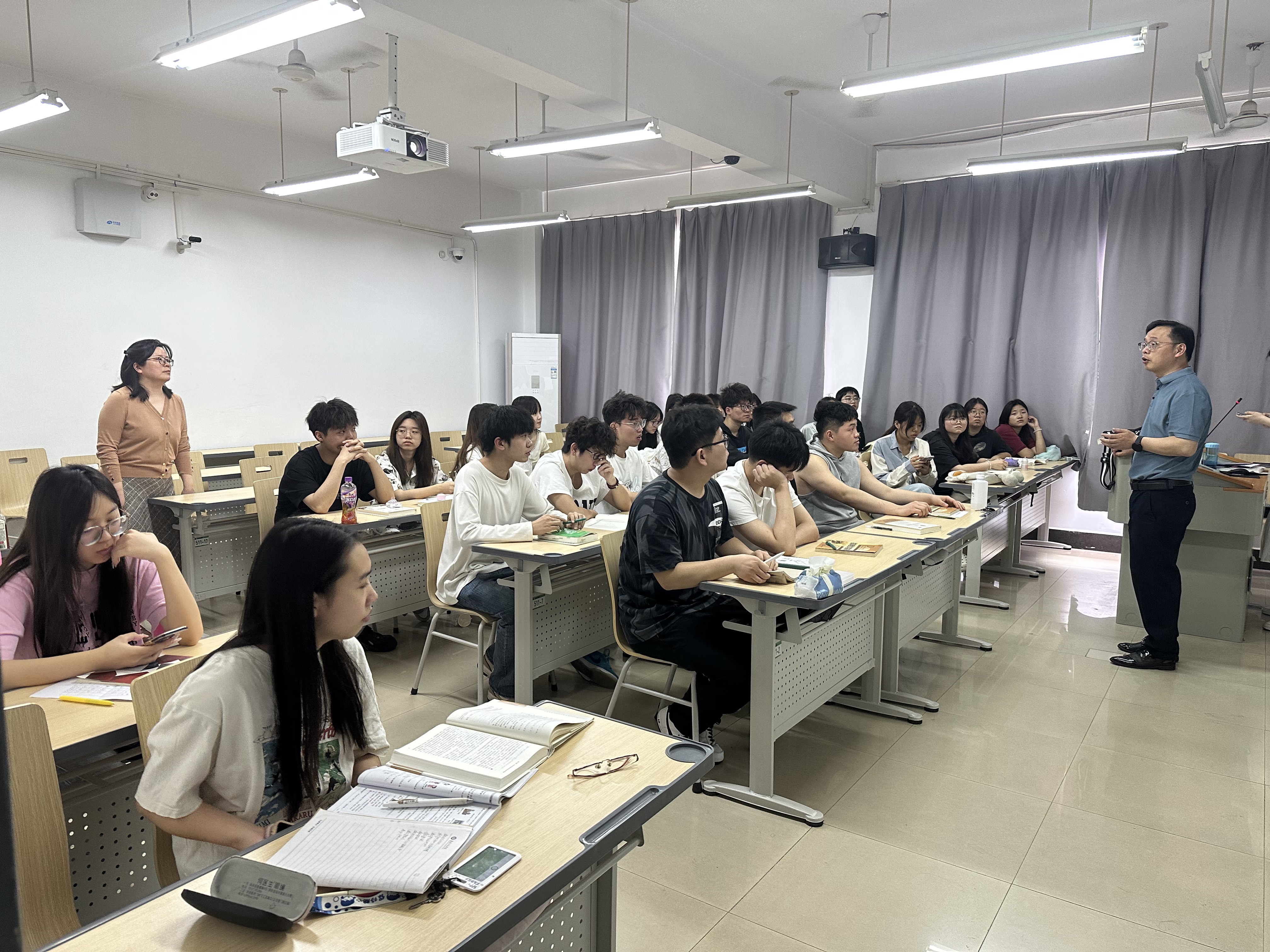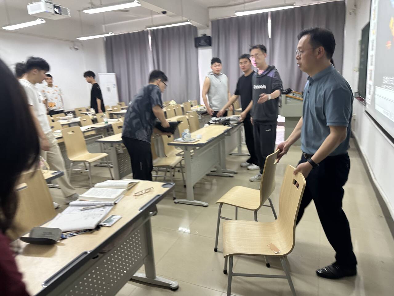 4 月 9 日上午第 3 节课课间,金学武院长带领教学副院长熊晓亮、书记朱威和教学秘书向老师来到外语楼 511 教室。他们利用课间休息时间,在不影响学生上课的前提下,与学生们一起将多余的桌椅整齐地摆放至教室后方,重新调整了教室内的布局,确保第一排座位能够正常使用,为学生们提供了更加宽敞、舒适的就坐空间,有效解决了前排就坐率低的问题。