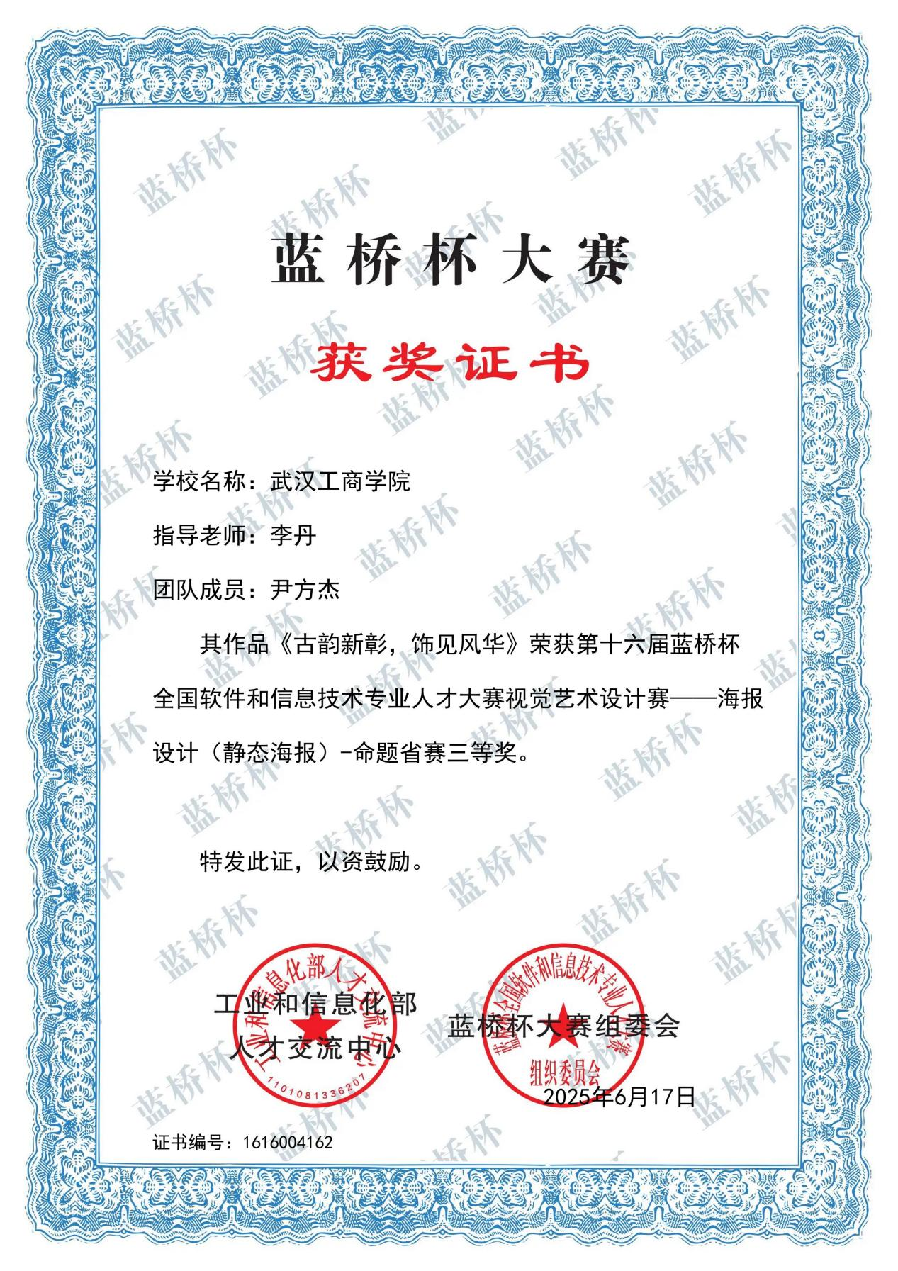 (图2-尹方杰十六届蓝桥杯视觉艺术设计赛获奖证书)