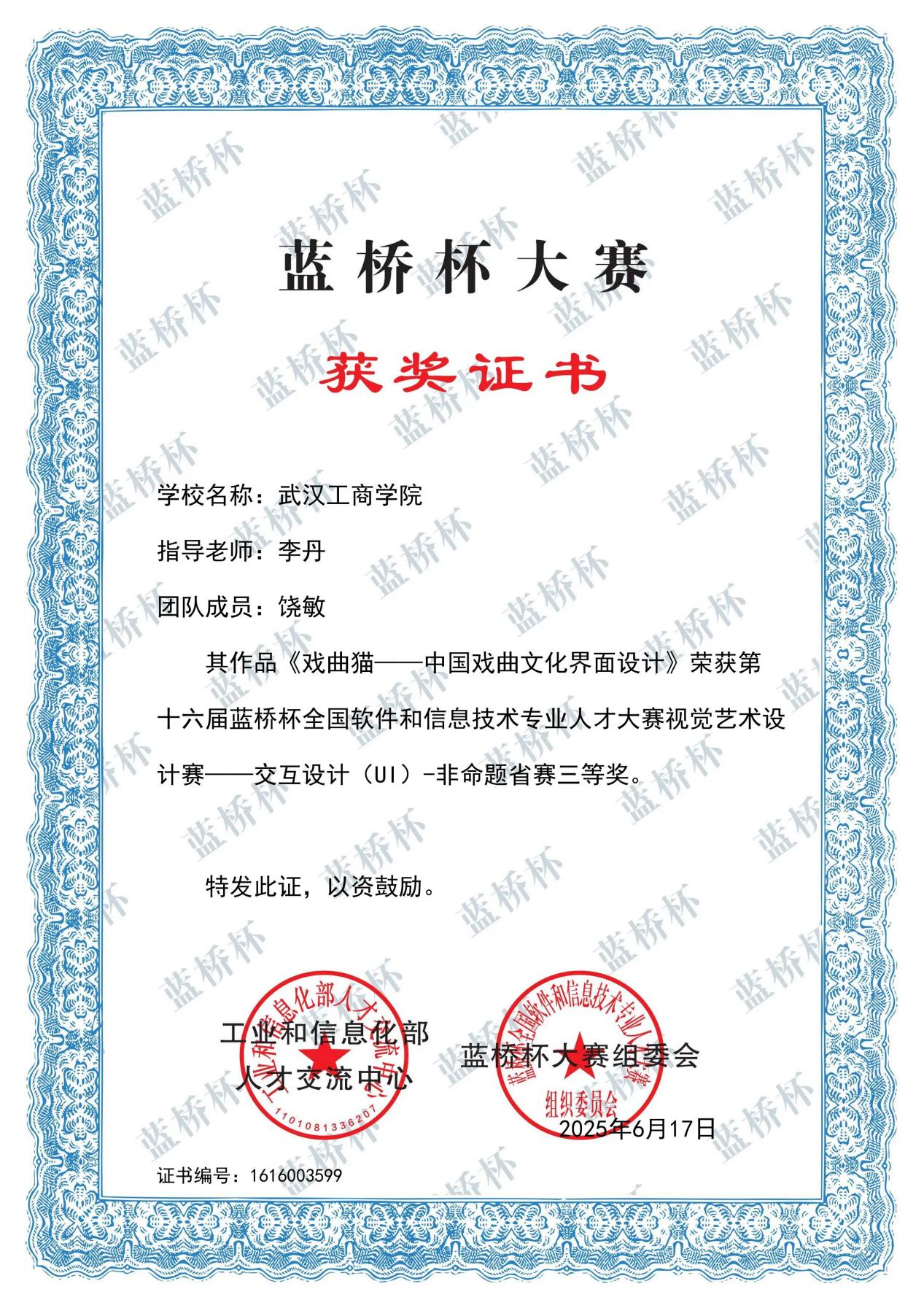 (图1-胡海彦十六届蓝桥杯视觉艺术设计赛获奖证书)