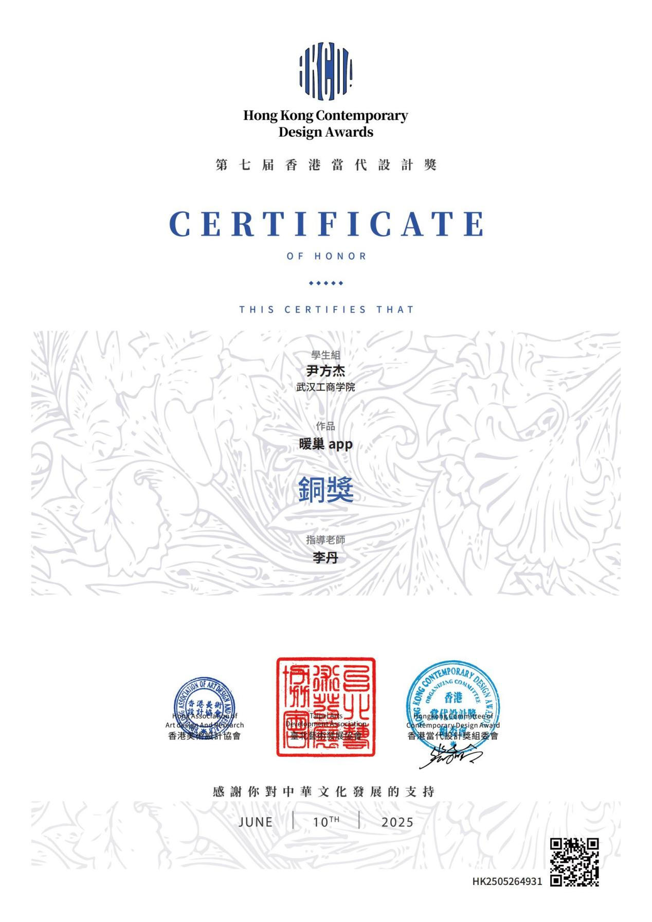 第七届香港当代设计赛国赛,汇聚全球设计新锐,竞争激烈。尹方杰同学在李丹老师指导下,一路突围,最终斩获国赛铜奖 。这不仅是个人创意与能力的高光时刻,更是学院设计教育与国际赛事接轨、培养顶尖设计人才的有力见证。