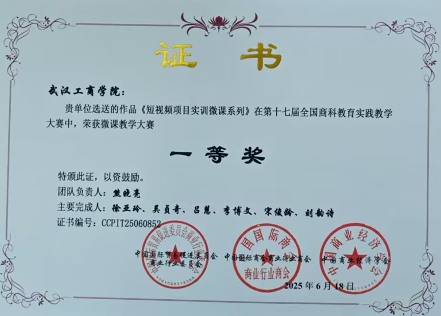 我我推送的作品《短视频项目实训微课系列》在全国商科教学科研课题大赛--微课教学大赛一等奖。该项目由副院长熊晓亮、徐亚玲领衔;核心成员均来自AWC万象城娱乐直播基地-短视频项目部专业技术老师:吴贞奇、吕慧、李博文、宋俊龄和刘韵诗老师;该作品凭借新颖的创作视角、扎实的专业技能、及出色的实践呈现,被组委会评选位全国一等奖。